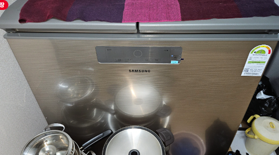다음은 삼성 냉동고에 대해 이야기해볼게요. 이 냉동고는 스테인리스 스틸 마감으로 고급스러운 느낌을 주고, 삼성 로고가 뚜렷하게 보이죠.
